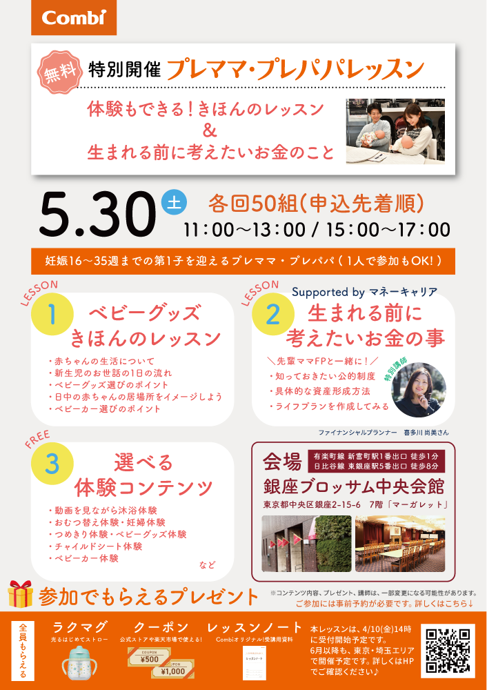 人気の『ベビーグッズ きほんのレッスン』に加え、赤ちゃんの将来のためにライフプランを作成してみるワークショップや『選べる 体験コンテンツ』等をご用意しています。